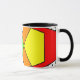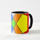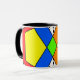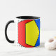 This mug has a Bauhaus design of overlapping pentagons, colored in red, yellow, orange, blue, and green with black dotted lines as a background.