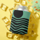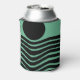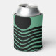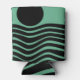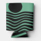 This can cooler has Bauhaus design of wavy lines and circles in black on a field of seafoam green.