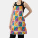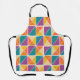 This apron has a Bauhaus design of squares made of triangles in shades of orange, yellow, purple, and blue.