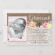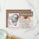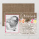 A Bautizo or Primera Comunión thank you card with burlap and lace effect background with bright watercolor florals and space for your little girl's photo.