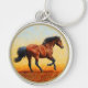 Bay wild mustang horse running across a dry grassy field. Realistic artwork created from an original oil painting by equine and wildlife artist Crista S. Forest.
