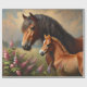 A heartwarming painting featuring a bay mare standing protectively beside her foal in a vibrant field of wildflowers. The soft brushstrokes and vivid details capture the tender bond between the horses, set against a serene and colourful countryside backdrop.