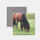 Photograph of a bay pony, horse, grazing in a patch of clover.