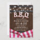 Rustic barbecue baby shower invitations featuring a country barn wood barrel background, twinkle string lights, red chequered tablecloth, and a couples shower celebration template that is easy to personalise.