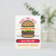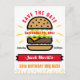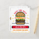 Announce your BBQ birthday party to family and friends with this custom announcement postcard suitable for all ages, featuring a modern graphic of a burger with flames in red, orange yellow, brown and black on a white background with colourful typography in bold fonts. Personalise it with all the details you need to invite your guests including the name, age, day, date and occasion on the cover and additional information with the addresses and RSVP details on the back. Designed by © Tim Coffey.