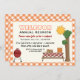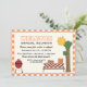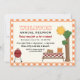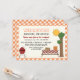 BBQ cookout picnic family annual reunion invitation with orange gingham or vichy border featuring a whimsical table with chequered tablecloth and burgers, potato salad, watermelon and orange juice on it, a red gas barbeque grill, a tree and the sun. Great for a summer picnic. Art elements by Alice Smith.