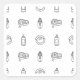 Modern barbecue food pattern featuring grilled steak, sausages, corn on the cob, sauce bottles, and BBQ tools in a sleek monochrome outline style on a black background. This seamless food design is perfect for restaurant branding, grill party invitations, menu backgrounds, packaging, kitchen décor, and food-themed digital projects. Bold, minimal, and stylish BBQ illustration concept.