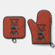 An oven mitt and pot holder feature a BBQ grill with steer's horns and legs.