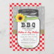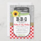 It's a BABY-Q! Invite all your friends and family with this adorable Baby Shower Invitation. Features cute mason jar with green gingham bow and yellow sunflower on a wood grain, canvas, and red gingham background.