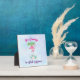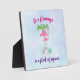 A plaque with a cute saying: Be a flamingo in a flock of pigeons. Designed with an illustration of a momma and baby pink flamingo standing on a bed of floral succulent flowers with green palm trees swaying in the back. Tropical and pretty. The background is a summery light blue watercolor with hints of purple.