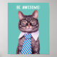 "BE AWESOME!" Cat Tie & Glasses, Teal Your Message Poster
