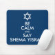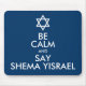 A parody of the popular "BE CALM AND CARRY ON" theme. A Star of David (Magen David) replaces the familiar crown accompanied by text reading, "BE CALM AND SAY SHEMA YISRAEL," referring to the Shema prayer which begins, "Shema Yisrael Adonai eloheinu Adonai ehad (Hear O Israel, the Lord is our God, the Lord is One). This is Judaism's declaration and affirmation of belief in one God.