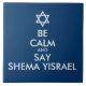 A parody of the popular "BE CALM AND CARRY ON" theme. A Star of David (Magen David) replaces the familiar crown accompanied by text reading, "BE CALM AND SAY SHEMA YISRAEL," referring to the Shema prayer which begins, "Shema Yisrael Adonai eloheinu Adonai ehad (Hear O Israel, the Lord is our God, the Lord is One). This is Judaism's declaration and affirmation of belief in one God.