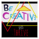 Embrace your inner genuis. "Be Creative and Thrive" expresses how important it is to look at things — whether in your life, your work, or yourself — in new and sometimes unusual ways. This inspirational message appears on a geometric abstract design in triangular shapes of shades of red, yellow, blue, and magena pink on a white and black background.
