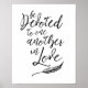 Calligraphy typography design in elegant black letters with fancy glyphs and alternatives and ornamental swash reads, "Be Devoted to One Another in Love." Design is accented with hand-drawn leaf. Scripture is from Romans 12:10. "Be Devoted to One Another in Love."