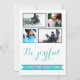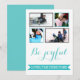 Be Joyful aqua banner modern Christmas flat photo card featuring the text “Be Joyful” in a script aqua blue font, an aqua banner and four photos of your family in two in turquoise and two in black frame. This elegant, simple and minimal holiday card is fully customisable and is great for your season’s greetings.
