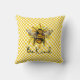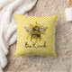 Sunny and bright throw pillow design features a yellow and white chequerboard pattern with fuzzy yellow and black bee & sunflowers overlay and "Be Kind" text.
