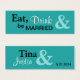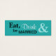 This chic small favour tag features an aqua blue background and the bride and groom's names and the wedding date in a combination of black and white whimsical and classic lettering. The large light blue ampersand finishes off this design. On the other side of this tag is the phrase Eat, Drink & Be married in a matching style. This modern tag is a great way to finish favour packaging. Coordinating products available.