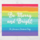 Beautiful rainbow Christmas party champagne bottle label in pretty bold colours that reads Be Merry and Bright. Cheerful gay pride themed holiday gifts for an LGBTQ family.