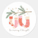 Add a festive and cheerful touch to your home holiday decor, Christmas gift, or greeting note with this adorable seasonal sticker. Sticker has red and pink stockings hanging on a pine tree branch with the text be merry and bright.