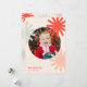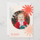 This cute and fun holiday card design features light blue, pink and red stylised pompom/star/snowflake shapes framing a round photo and text reading “Be Merry” in red on a light cream background. The photo, name and greeting can be easily customised for a personal touch. Also available as a digital Christmas card download.