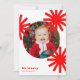 This cute and fun holiday card design features bright red stylised pompom/star/snowflake shapes framing a round photo and text reading “Be Merry” in red on a white background. The photo, name and greeting can be easily customised for a personal touch. Also available as a digital Christmas card download.