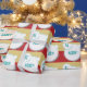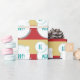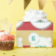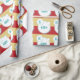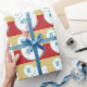 This Christmas gift wrapping paper features white circles with a trendy teal watercolor border and a dark red and gold background. Custom text reads: BE MERRY!