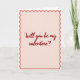 This card features a sweet, romantic setting with the words “Will you be my valentine?” written beautifully in dark red. The text pops against a soft light pink background, creating a warm and inviting place for such a heartfelt question. The overall mood feels hopeful and nostalgic, like an old-fashioned love letter.