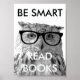 Be smart read books poster with funny owl photo. Bird owl wearing nerdy glasses. Cool print design to promote reading.