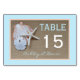 This unique beach and burlap wedding table numbers card features a blue, peach and white border for the burlap background on which a seashell, starfish and sand dollar appear. The word "Table" appears to the right of the beach theme shells, as does the number (which you can customise). What makes this table card so special is you can customise it with your names at the bottom. Copyright henishouseofpaper