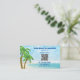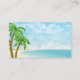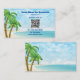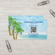This business card with QR Code features a tropical beach with palm trees. The water is a beautiful blue and there are clouds scattered in the sky. - Created by MI Designs