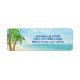 This address label features a tropical beach with palm trees. The water is a beautiful blue and there are clouds scattered in the sky. Created by MI Designs