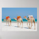 Three camels walking on a white sand beach with a clear blue sky and turquoise water in the background, the camels are light brown with saddles of different colors, the first two have orange and red saddles, while the third has a white saddle, the composition is simple and clean, with the camels as the main focus, the lighting is bright and natural, creating a warm and inviting atmosphere.