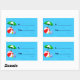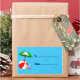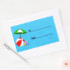 A custom gift tag sticker with beach or swimming pool themed art of a red beach ball, green sun umbrella, vacation sandals and suntan oil on a watery blue background with curly waves.