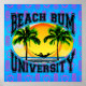 Beach Bum University, man relaxing in a hammock between two palm trees enjoying the sunset over the ocean. Pink background of Hawaiian Honu turtles and Tiki Masks.
