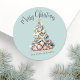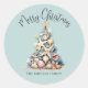 Celebrate in sunny style with this festive round sticker, perfect for your tropical holiday celebration. A large Christmas tree made of beach shells, starfish, and coral sits in the centre, bringing a fun and whimsical coastal vibe to your event. The background is teal blue, with grey fonts adding a soft, elegant contrast. The family name or a custom line of text appears along the bottom for a personal touch. All text, fonts, and colours can be customised. Ideal for sealing favours, decorating gifts, or adding a coastal detail to your celebration.