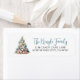 Beach Christmas Tree Return Address Label. This festive return address label features a charming Christmas tree crafted from seashells and starfish, topped with a starfish and blending soothing blue and green hues that evoke the beauty of the ocean. The tree design is on the left, while your name and address appear on the right in a mix of script and serif fonts, adding a casual yet elegant touch.