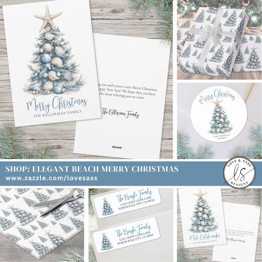 Perfect for Christmas cards or holiday invitations, this design adds a touch of seaside charm to your mail. A great choice for anyone who loves coastal decor, winter blues, or a modern beach holiday style.