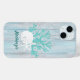 Personalise this coastal beach driftwood phone case, with a white sand dollar and 2 starfish and aqua glitter coral branch, for yourself or a gift.