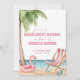 Watercolor Beach Destination Bachelorette Weekend Invitation. A cool watercolor beach theme with shades of pink and teal, setting the vibe for a beach escape with the bride and her besties. From trips to Florida, California, or even something more international like Mexico, Hawaii or The Bahamas, this girls weekend is going to rock! Cute pink and white beach chair, umbrella, and even a flamingo floaty for some extra fun. Palm trees swaying, shells to collect—it's all about those chill tropical beach vibes. With modern fonts adding a stylish twist, it's the perfect look for your bachelorette weekend. Just you and your crew, making memories against a backdrop of sand and sea. If you want a little more 'pizzaz' on the front, there are two hidden art objects for the top right corner - a sun, or a second palm tree. Just tap on the 'eye' icon next to them in the design editor to make them appear. Check out all of the coordinating pieces too!