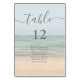 Write your wedding guest list reservation in this vintage wedding table number card featuring a beach front background for a summer tropical wedding theme.