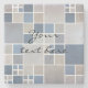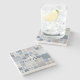An elegant stone coaster with a modern mosaic design inspired by the beach in blue, grey and beige colours, with a subtle watercolor effect.