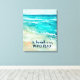 Add a sea and salty air vibe to your walls with this coastal wrapped canvas print featuring watercolor tropical turquoise ocean waves, coral starfish and "the beach is my happy place" caption in a nautical navy blue handwriting font. Art by KL Stock
