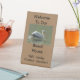 Add a special welcome to your beach house with this standing sign featuring a pelican photo. This beautiful large bird is floating on the water and relaxing. A welcome message as well as easy access to your wifi code and emergency contact number can be set at any location in your home. The brown background and all text can easily be customised.