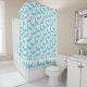 This pretty shower curtain has an original pattern of blue whales, seashells, anchors and lobsters. It has a striped edge where you can add your family beach house name or other text.