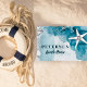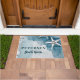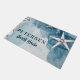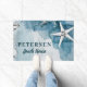 Modern trendy summer vibes coastal beach cottage decorative family personalised doormat featuring an under ocean inspired modern hand-drawn white starfish pattern over an aqua blue background. ++++++++++ Perfect for your summer home!