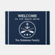 Welcome to Our Beach House personalised with your custom family name entryway doormat. Featuring a custom designed nautical boat anchor with crossed oars, stars and rope boarders on beautiful deep navy blue. Easily change the background colour to match your current decor. Makes a great gift.