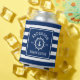 Nautical Anchor Rope Helm Family Name Beach House Navy Blue and White Striped Can Cooler