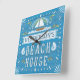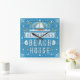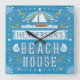 This elegant, personalised beach house square clock will add a unique custom touch to your coastal decor. The one-of-a-kind design is made to resemble blue wood grain with white text and elegant flourishes in shades of brown and golden yellow. At the top, the design includes a sailboat on the waves, seagulls flying past. Nautilus shells surround the "Beach House" text, which is made to look slightly worn.
