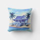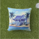 Pillow in a charming beach house with a veranda stands nestled between two tall palm trees, facing a serene ocean under a bright, clear sky.